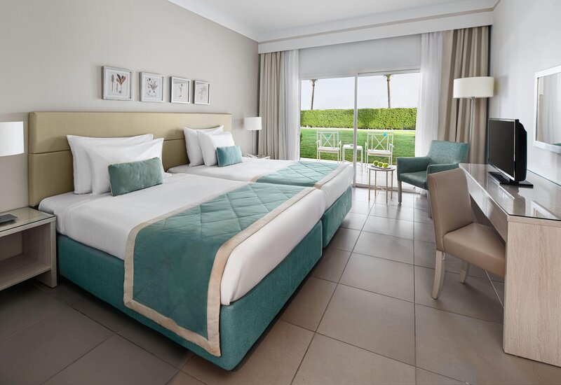 Hotel dysponuje 487 pokojami o różnej charakterystyce i widokiem na basen lub pole golfowe. Wszystkie pokoje są elegancko urządzone i wyposażone w indywidualnie sterowaną klimatyzacje, łazienkę z WC, suszarkę do włosów, TV sat. z telewizorem LCD, mini bar (w cenie butelka wody uzupełniana codziennie), sejf, telefon, zestaw do parzenia kawy/herbaty, balkon lub taras ze stołem i dwoma krzesłami. POKOJE SUPERIOR- ok. 34 m2, POKOJE RODZINNE- ok. 43 m2, SUITA- ok. 96 m2.
